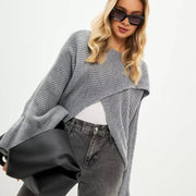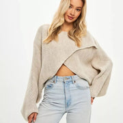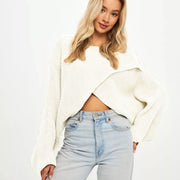 White Navel-exposed Bat-knitted Boat Neck Irregular Sweater