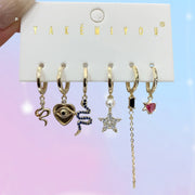 Color Copper Zircon Snake-shaped Heart Chain Earrings 6-piece Set