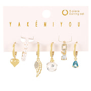 Fashion Gold Copper Inlaid Zircon Pearl Heart Feather Pendant Earrings Set Of 6